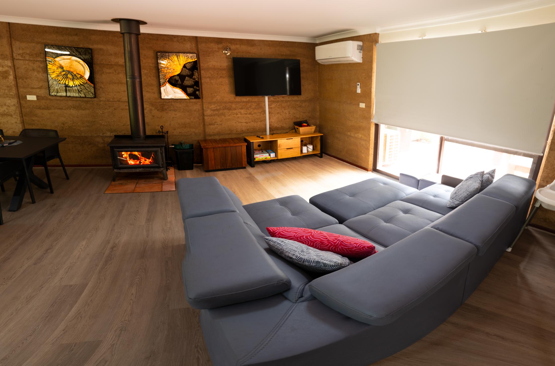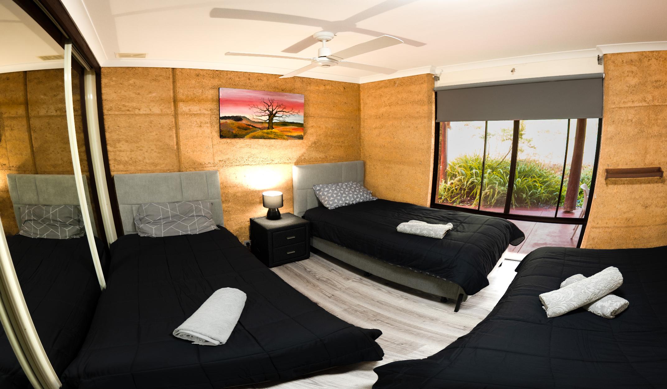Blue Wren Cottage has the ability to sleep 9 people comfortably. Along with a self contained kitchen and lounge room with a wood fire, it contains 3 bedrooms, The first bedroom has a queen sized bed, the second room a queen sized bed and a single bed, and the third bedroom containing three single beds.Wifi is Included